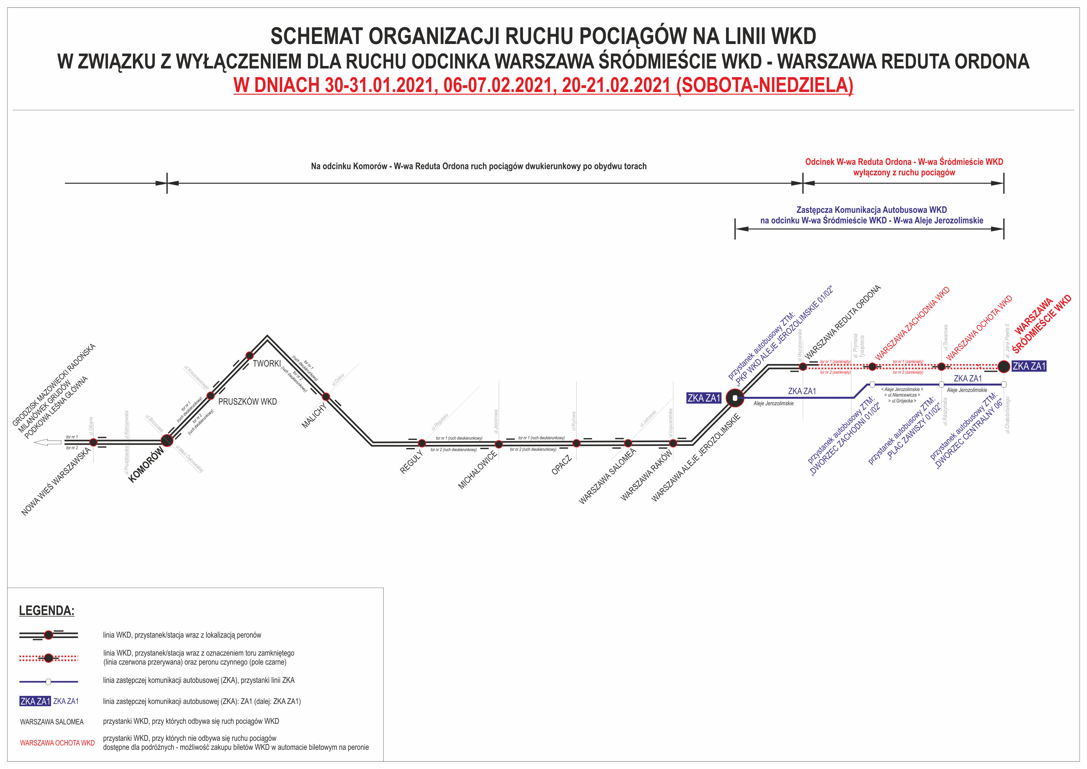 Schematy organizacji ruchu pociągów WKD oraz zastępczej komunikacji autobusowej obowiązującej w soboty i niedziele: 30-31.01.2021, 06-07.02.2021, 20-21.02.2021: