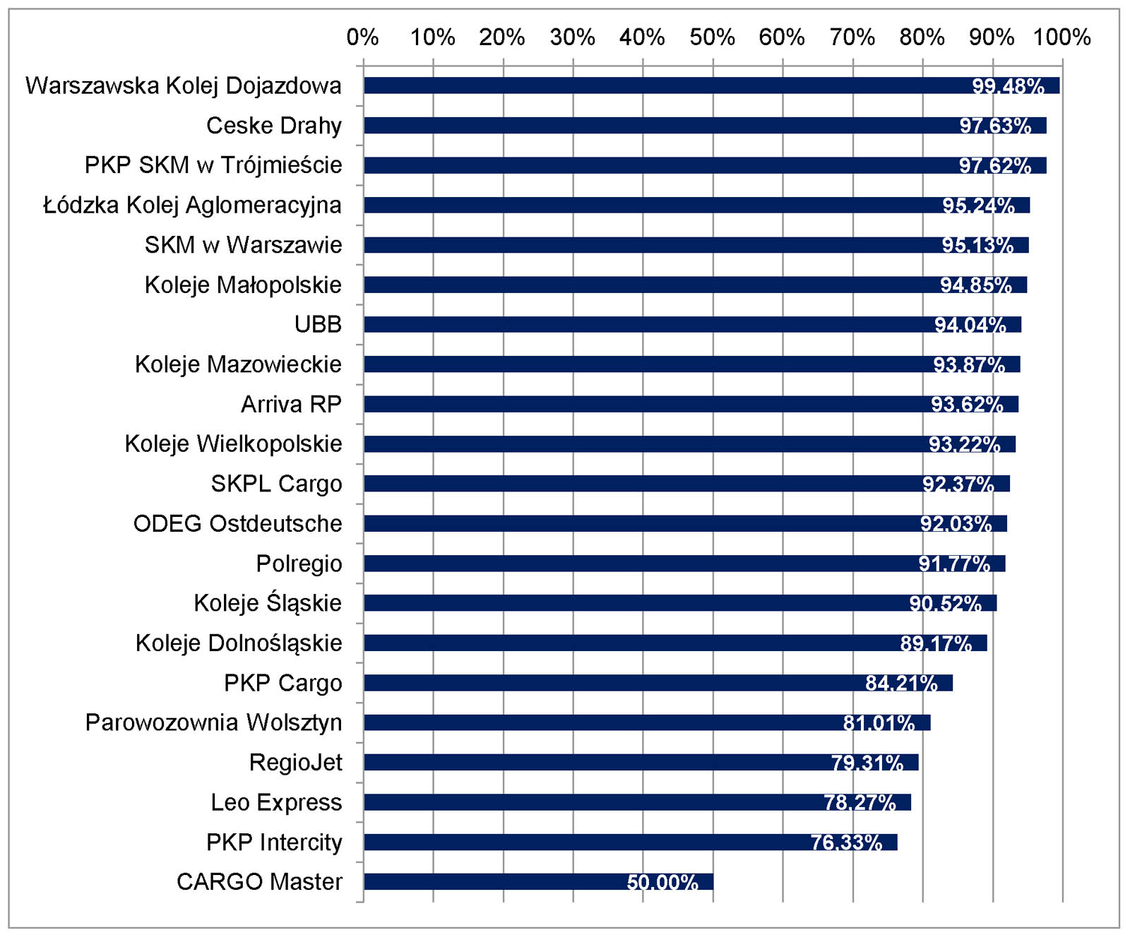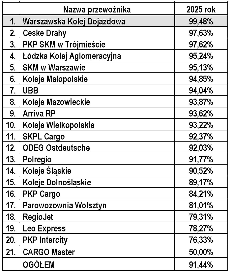 Warszawska Kolej Dojazdowa sp. z o.o. informuje, że według najnowszych danych opublikowanych przez Urząd Transportu Kolejowego, dotyczących punktualności przewozów pasażerskich w ciągu całego 2025 roku, z wyszczególnieniem przewoźników kolejowych, dla realizowanych przez nich na terenie kraju stałych połączeń rozkładowych, po raz kolejny okazała się najpunktualniejszym przewoźnikiem, osiągając poziom 99,48%. Na kolejnych miejscach uplasowały się: Ceske Drahy z wynikiem 97,63%, PKP SKM w Trójmieście z wynikiem 97,62% oraz Łódzka Kolej Aglomeracyjna z wynikiem 95,24%. Szczegółowe dane w omawianym zakresie zawarto w poniższej tabeli.