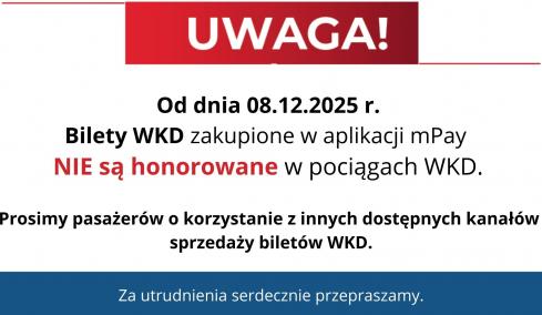 Warszawska Kolej Dojazdowa sp. z o.o. informuje, że z dniem 8 grudnia 2025 r. z przyczyn niezależnych od Spółki kończy współpracę z firmą mPay . Bilety WKD w aplikacji mPay będą dostępne wyłącznie...