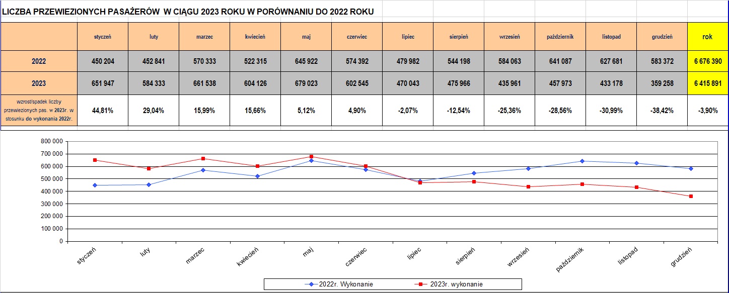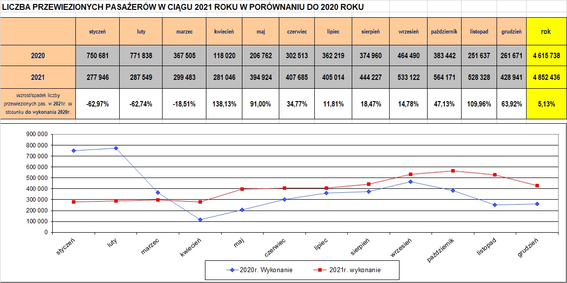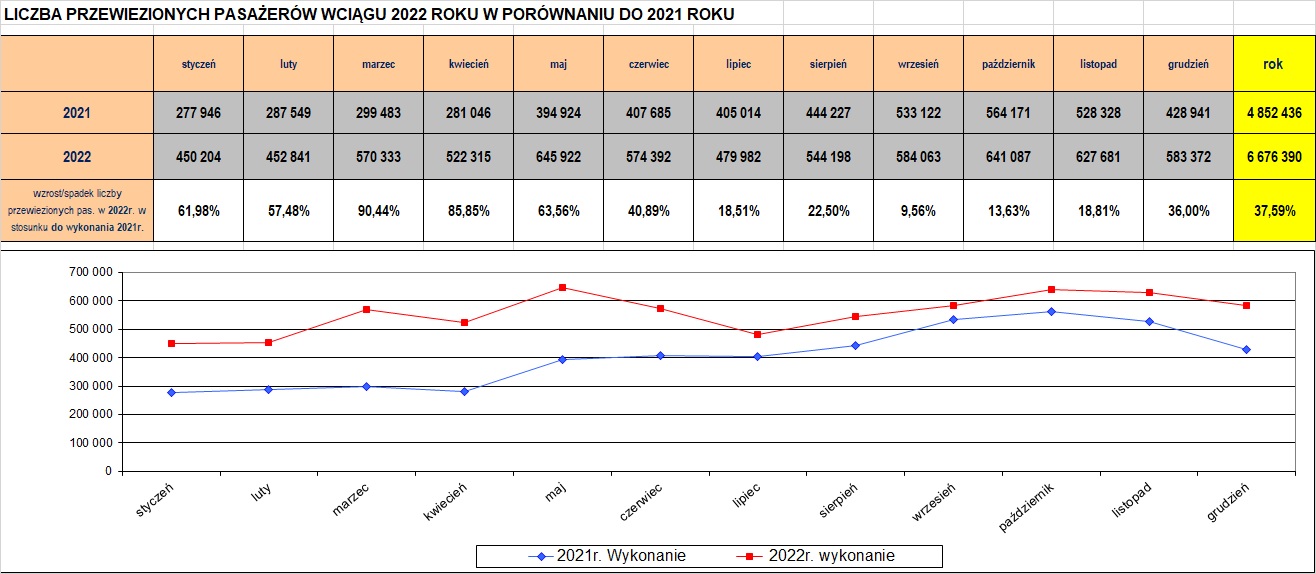 Tabelaryczne i graficzne zestawienie wyników przewozowych w latach 2019-2020 (kliknij w polu obrazka aby powiększyć):